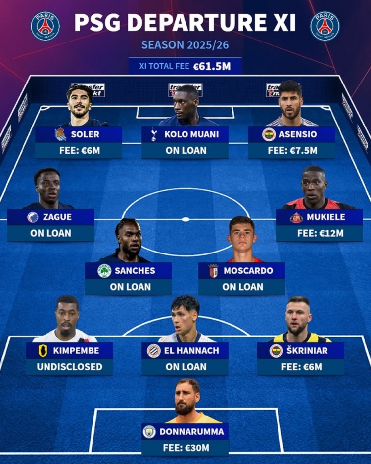 9月10日讯 新科欧冠冠军巴黎在今夏完成大清洗,《转会市场》也列出了一套巴黎今夏离队阵容,多纳鲁马领衔。
